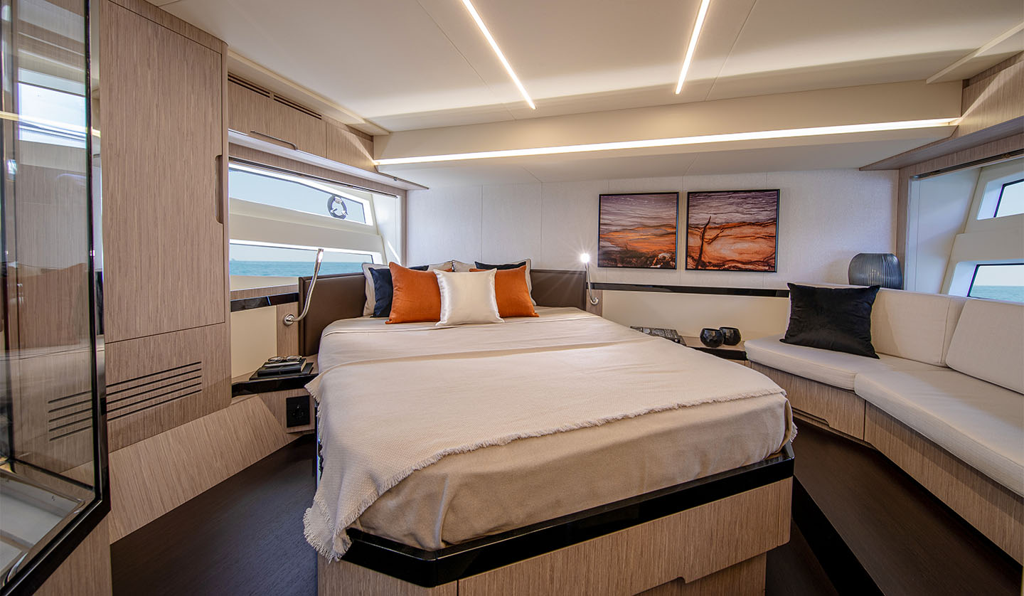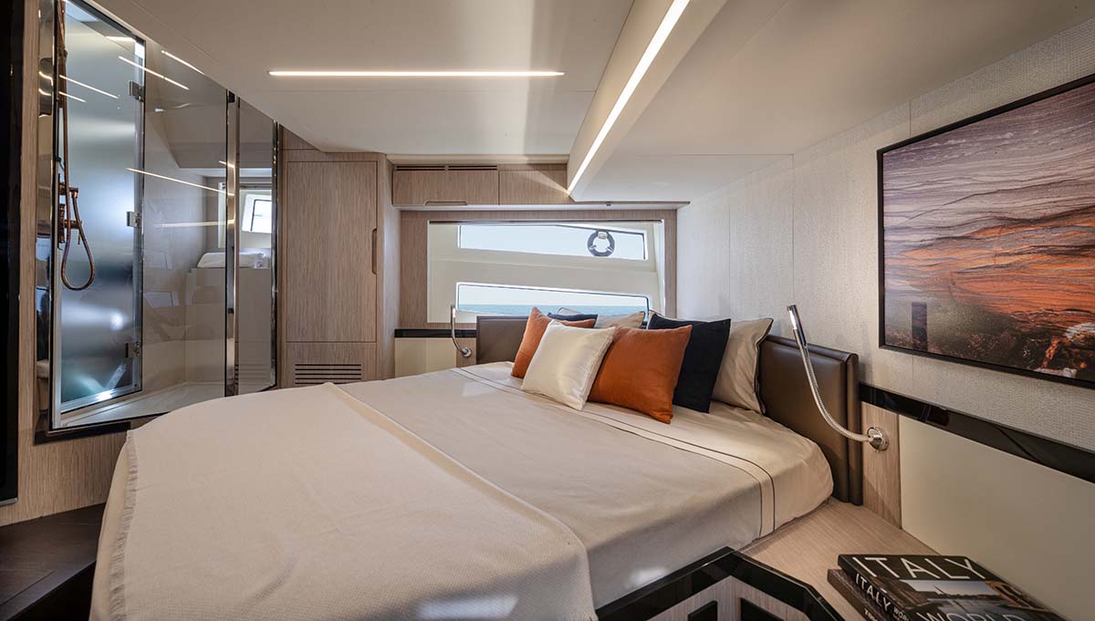 La cabina armatoriale vanta un’area relax fornita di un divanetto e un’ampia doccia vetrata.