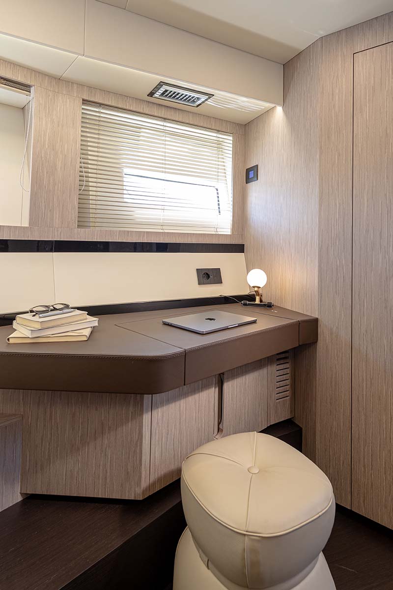 Nella cabina VIP è prevista una zona da configurare a seconda delle esigenze dell’armatore: zona breakfast/ufficio, zona bar o vanity.